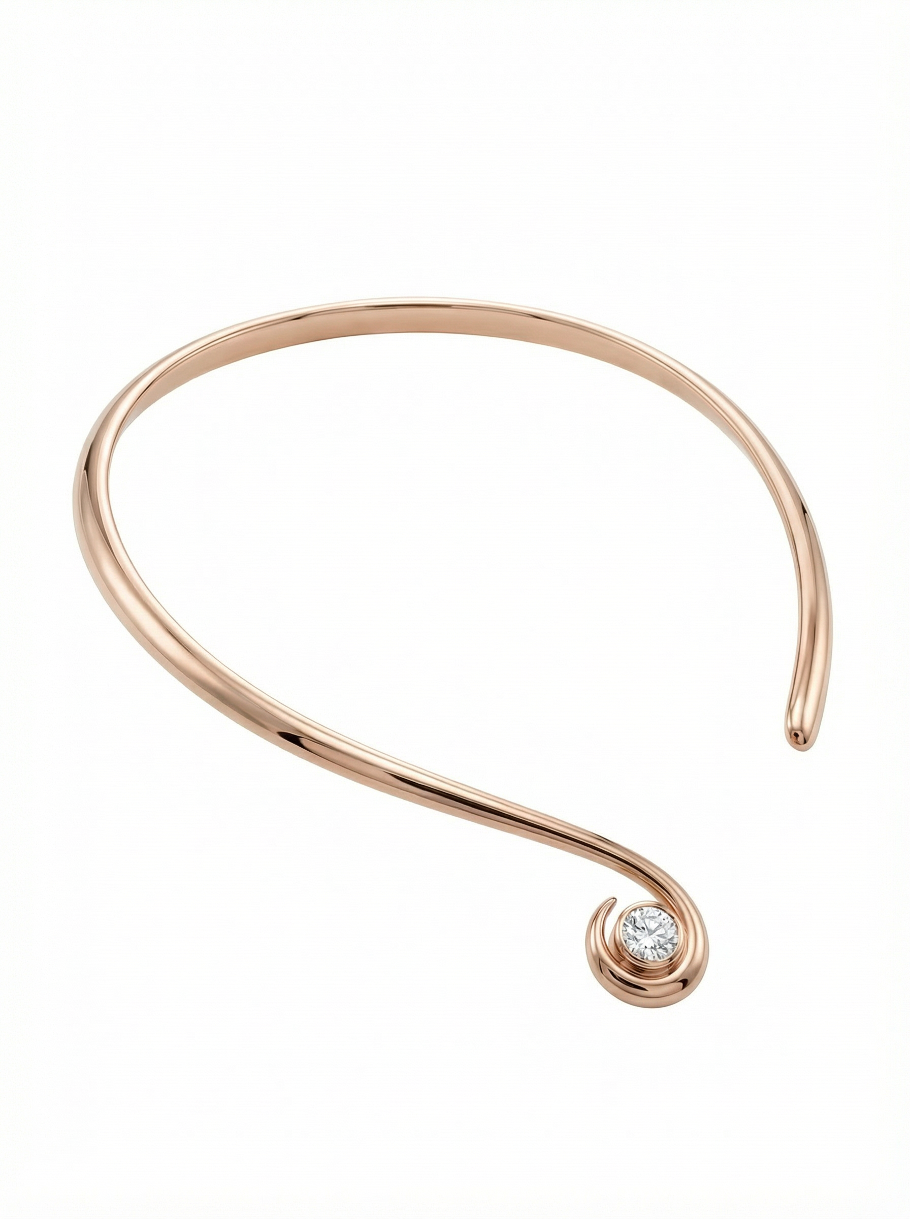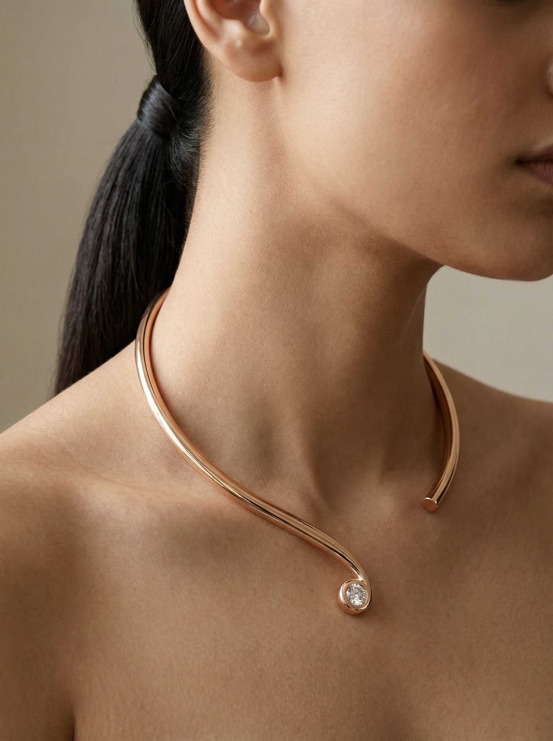 Pulse is a contemporary necklace that draws inspiration from rhythm and repetition. Crafted in rose gold and accented with moissanite, the design feels fluid yet structured, capturing movement through form rather than excess detail. The warm metal tone softens the silhouette, while the stones add measured brilliance.